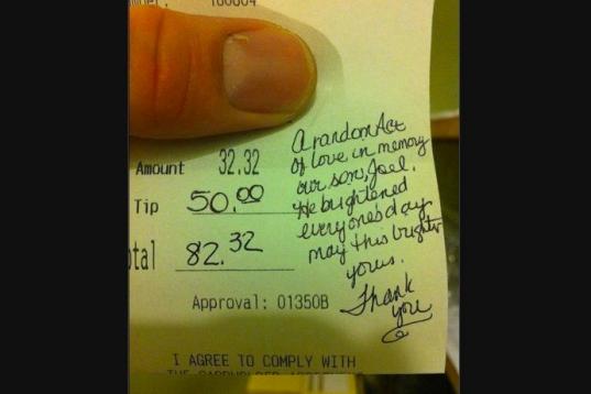 50 dólares de propina, unos días antes del Día de Acción de Gracias. "Un acto de amor en memoria de nuestro hijo, Joel", escribieron, deseando hacer un poco mejor el día del afortunado camarero.