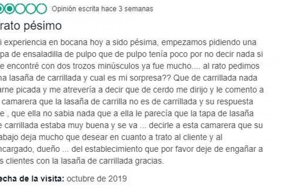 “Decirle a esta camarera que su trabajo deja mucho que desear en cuanto a trato al cliente y al encargado, dueño ... del establecimiento que por favor deje de engañar a los clientes con la lasaña de carrillada gracias”, concluía la comensal en TripAdvisor.