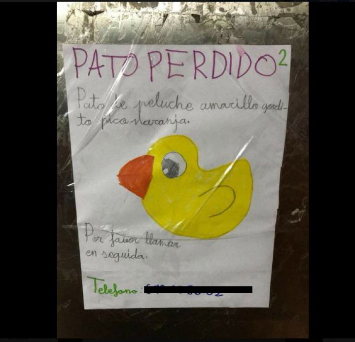 En uno de ellos se puede leer el siguiente aviso: "Pato de peluche perdido. Pato de peluche amarillo gordito y pico naranja. Por favor llamar enseguida". Ilustrado con un bonito dibujo del muñeco extraviado.