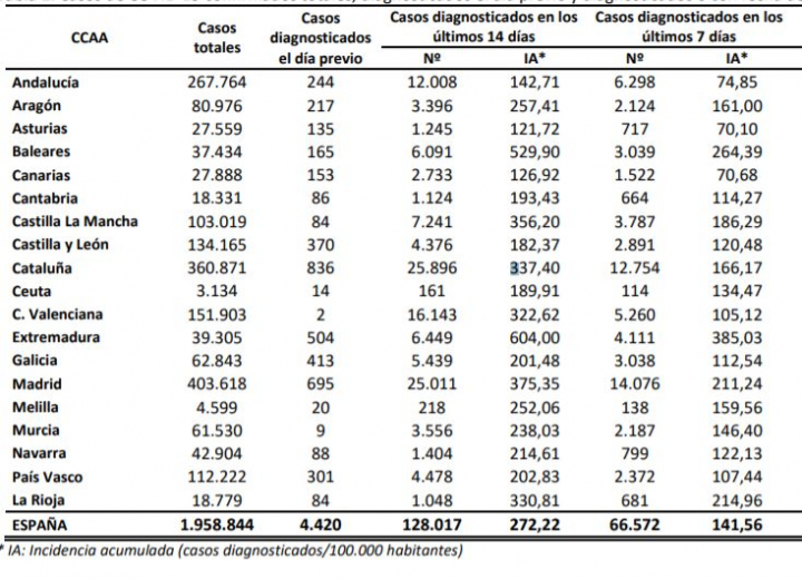 Según el último informe del Ministerio, nueve comunidades o ciudades autónomas están por encima de 250 casos por 100.000 habitantes, uno de los umbrales que marcó Sanidad como indicador de riesgo extremo. Algunas regiones, como Aragón, Cataluña y Andalucía, ya han anunciado nuevas restricciones, y otras comunidades podrían sumarse a ellas, ha anticipado Salvador Illa.