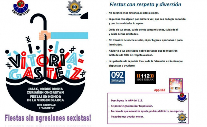 El Movimiento Feminista de Vitoria ha pedido a la Ertzaintza y Policía local de la capital alavesa que retiren los folletos que están difundiendo, durante las fiestas de la capital, con consejos y medidas de prevención para evitar agresiones sexistas, ya que, en su opinión, “vuelven a hacer a las mujeres responsables” de su seguridad.