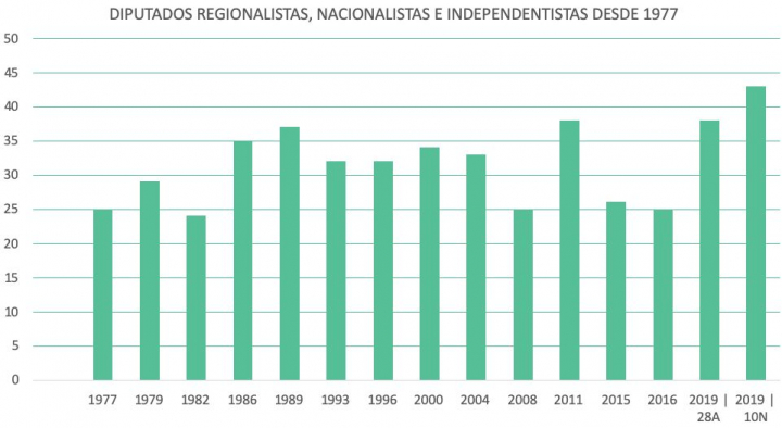 El sistema de partidos español saltó por los aires en 2015. El bipartidismo imperfecto de PP y PSOE murió. Entonces, Podemos y Ciudadanos emergieron como fuerzas alternativas. Y los morados, gracias a las confluencias con formaciones regionalistas de izquierda en la periferia del país (Valencia, Andalucía...), lograron situar en mínimos históricos el número de diputados regionalistas e independentistas (25). Solo en 1982 hubo menos (24), cuando el PSOE de Felipe González conquistó, casi literalmente, el Congreso con 202 diputados.