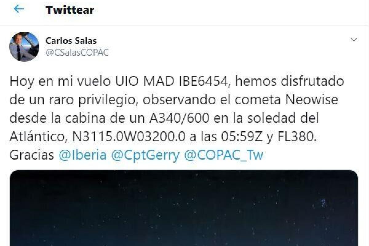 “Hoy en mi vuelo UIO MAD IBE6454, hemos disfrutado de un raro privilegio, observando el cometa Neowise desde la cabina de un A340/600 en la soledad del Atlántico, N3115.0W03200.0 a las 05:59Z y FL380”, ha escrito el comandante Carlos Salas, que es también decano del Colegio Oficial de Pilotos de la Aviación Comercial.