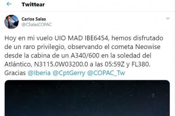“Hoy en mi vuelo UIO MAD IBE6454, hemos disfrutado de un raro privilegio, observando el cometa Neowise desde la cabina de un A340/600 en la soledad del Atlántico, N3115.0W03200.0 a las 05:59Z y FL380”, ha escrito el comandante Carlos Salas, que es también decano del Colegio Oficial de Pilotos de la Aviación Comercial.