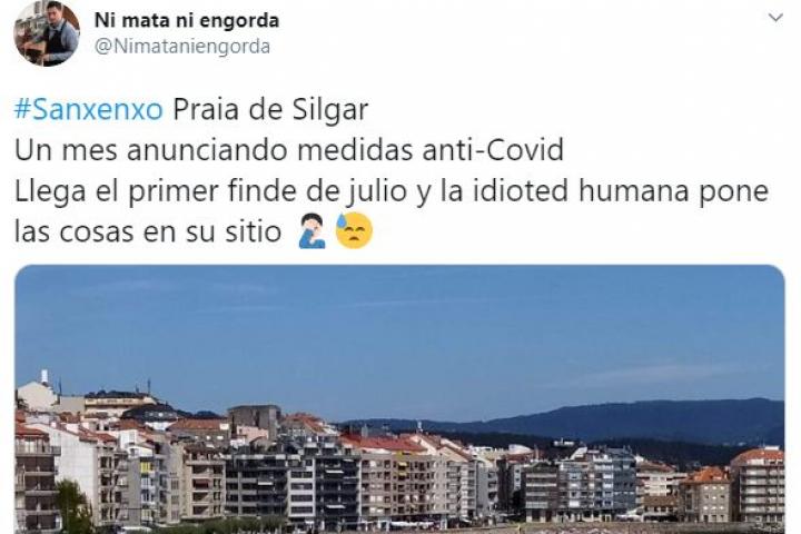 “Praia de Silgar Un mes anunciando medidas anti-Covid Llega el primer fin de semana de julio y la idiotez humana pone las cosas en su sitio”, ha escrito el usuario.