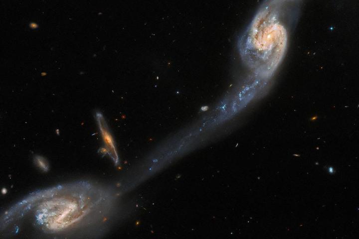 La instantánea del Hubble, muestra dos de las galaxias del triplete galáctico Arp 248, conocido como Triplete de Wild. Se trata de tres pequeñas galaxias espirales que interactúan entre sí a través de varios puentes de estrellas y polvo interestelar. Las dos grandes galaxias espirales, que flanquean una galaxia espiral de fondo más pequeña y no relacionada, aparecen conectadas por un puente luminoso.
