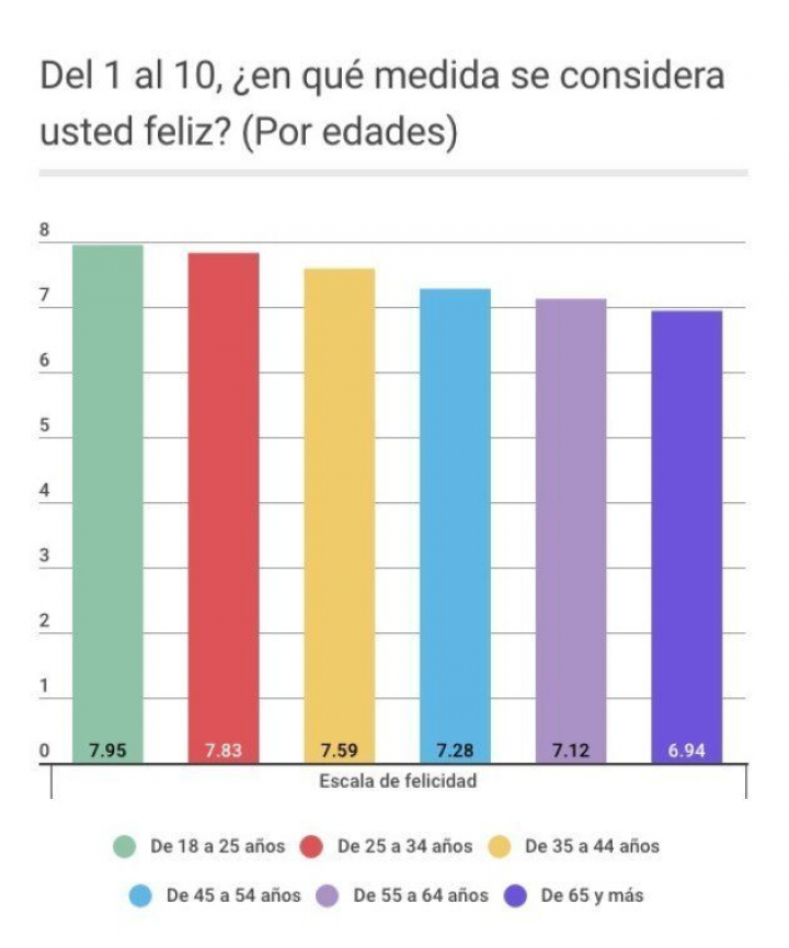 Aunque todos los grupos de edad aprueban en cuanto a lo felices que se sienten, parece que el secreto de la felicidad está en la juventud porque son los más jóvenes, el grupo de edad comprendido entre los 18 y 25 años, quienes aseguran que se sienten más felices (7,95 de media).