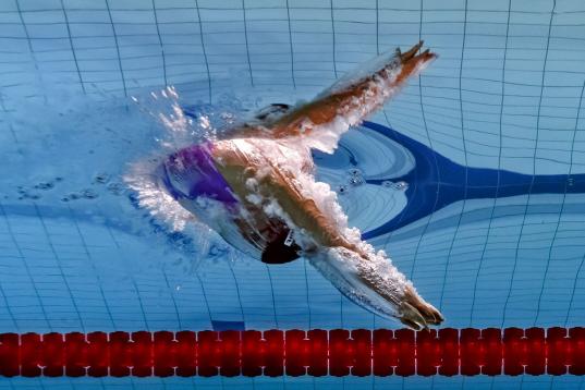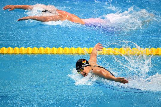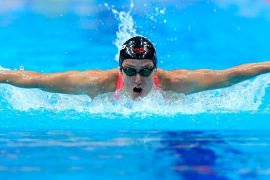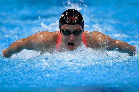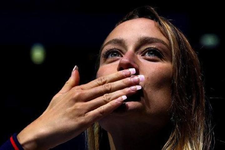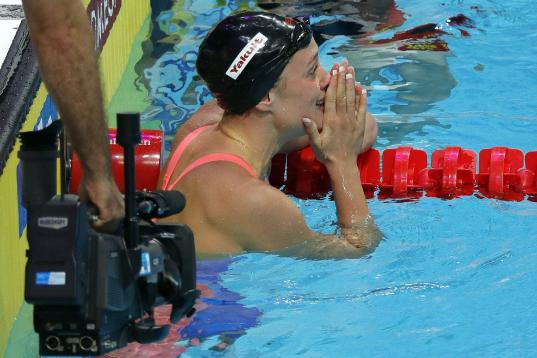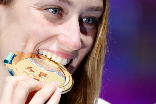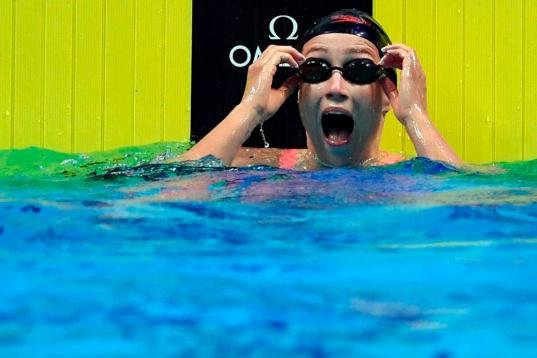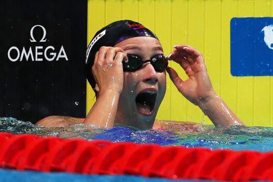 La deportista, medalla de oro en 200 mariposa en los Mundiales de Natación, sólo puede reírse nerviosamente.