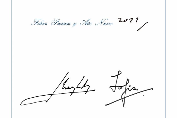 Además, hay también una sorpresa: una tarjeta con una imagen religiosa firmada por Juan Carlos I y por doña Sofía en la que trasladan un mensaje de buenos deseos para estas fechas navideñas.