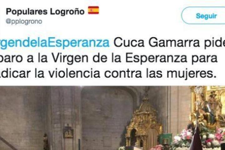 Andrea Ropero, presentadora de La Sexta Noche, ha respondido con contundencia a un tuit del PP de Logroño en el que se informaba de que la alcaldesa de la ciudad, la 'popular' Cuca Gamarra, había pedido amparo a la Virgen de la Esperanza para erradicar la violencia contra las mujeres.