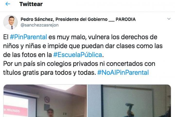 Por ejemplo, una cuenta que parodia al presidente del Gobierno, Pedro Sánchez, la ha difundido en Twitter junto al mensaje: “El #PinParental es muy malo, vulnera los derechos de niños y niñas e impide que puedan dar clases como las de las fotos en la #EscuelaPública. Por un país sin colegios privados ni concertados con títulos gratis para todos y todas”.