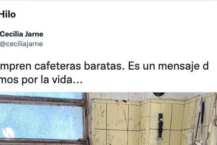 “No compren cafeteras baratas. Es un mensaje de luchemos por la vida...”, ha escrito la usuaria junto a la foto en la que se ve cómo la cafetera ha saltado por los aires, dejando la pared y el suelo completamente sucio.
