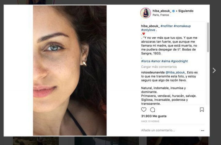 La actriz Hiba Abouk ha sorprendido en su cuenta de Instagram —donde tiene más de 644.000 seguidores— con una fotografía sin filtros y sin maquillaje.