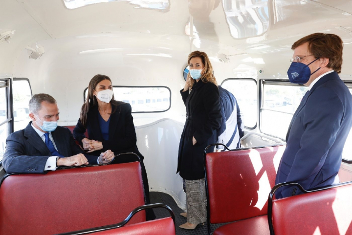 Los reyes han pasado un día metidos entre autobuses urbanos con motivo del 75 aniversario de la Empresa Municipal de Transportes (EMT) de Madrid. Ambos han recorrido parte del trayecto de la línea 001 junto con otros viajeros y luego se han acercado a ver cinco vehículos históricos expuestos para la ocasión en las cocheras.