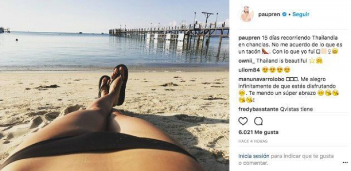 "15 días recorriendo Thailandia en chanclas. No me acuerdo de lo que es un tacón. Con lo que yo fui", ha escrito Prendes junto a una imagen en la que se la ve descansando en una playa, con un bikini negro y unas chanclas a juego.