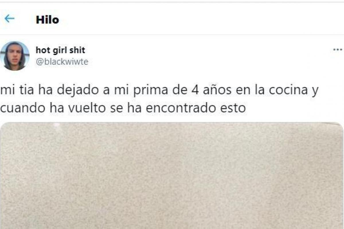 mi tia ha dejado a mi prima de 4 años en la cocina y cuando ha vuelto se ha encontrado esto pic.twitter.com/HiprRiU3Zw