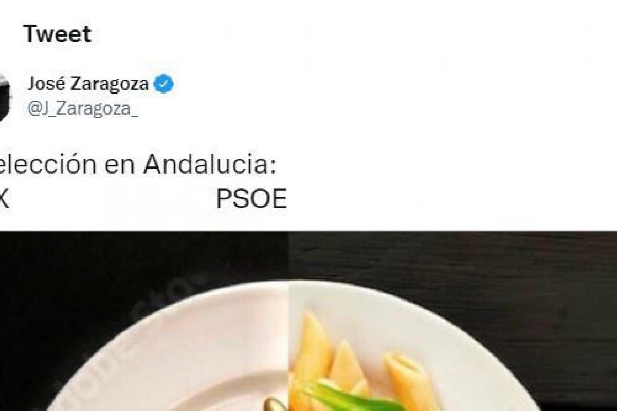 “La elección en Andalucía: VOX PSOE”, ha escrito junto a la imagen en cuestión, en la que se ve un plato partido a la mitad. En la parte que atribuye a Vox se ven un montón de balas y en la del PSOE, en cambio, macarrones.