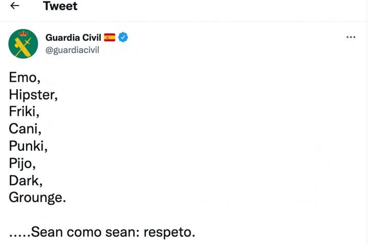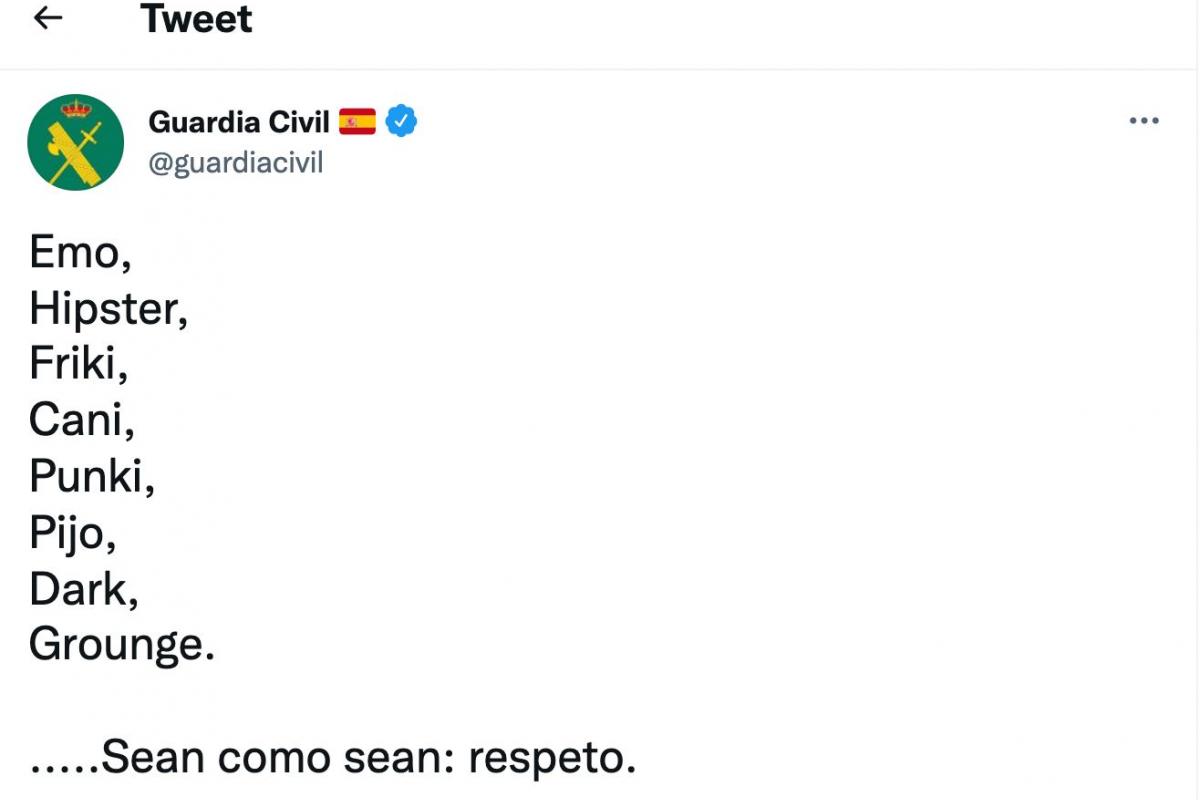 La cuenta oficial de la Guardia Civil en Twitter, con más de 1,7 millones de seguidores, ha generado un importante revuelo en la red social del pájaro azul con una publicación sobre supuestas tribus urbanas.
