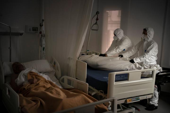 “Trabajadores de una funeraria retiran el cuerpo de un fallecido por coronavirus mientras su compañero de habitación duerme, en una residencia de Barcelona”, es el pie de una imagen tomada el pasado 5 de noviembre. En ella se ve a dos operarios, con sus trajes de protección obligatoria, amortajando un cuerpo en una cama articulada, separada apenas por una cortina leve del que había sido su compañero de estancia, que duerme entre las sombras.