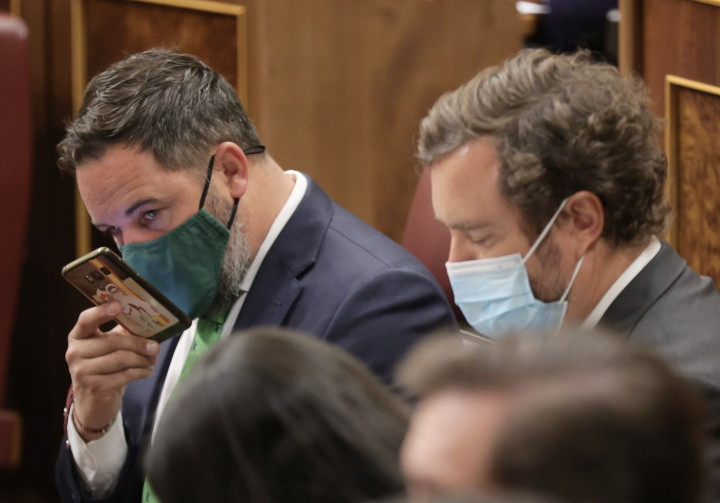 Los fotógrafos en el Congreso captaron la semana pasada un curioso momento en el que el líder de Vox, Santiago Abascal, está consultando su móvil en el escaño junto a Iván Espinosa de los Monteros, portavoz del partido en la Cámara.