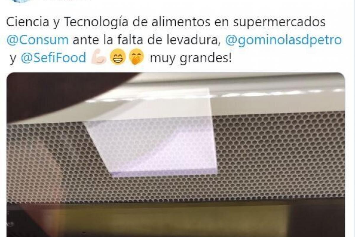 Los supermercados tratan de hacer frente a la situación como pueden y algunos le echan mucha imaginación. Es el caso de un Consum, que a la vista del desabastecimiento de la levadura han decidido poner en el lugar que ocuparía en el estante una receta para hacerla casera.