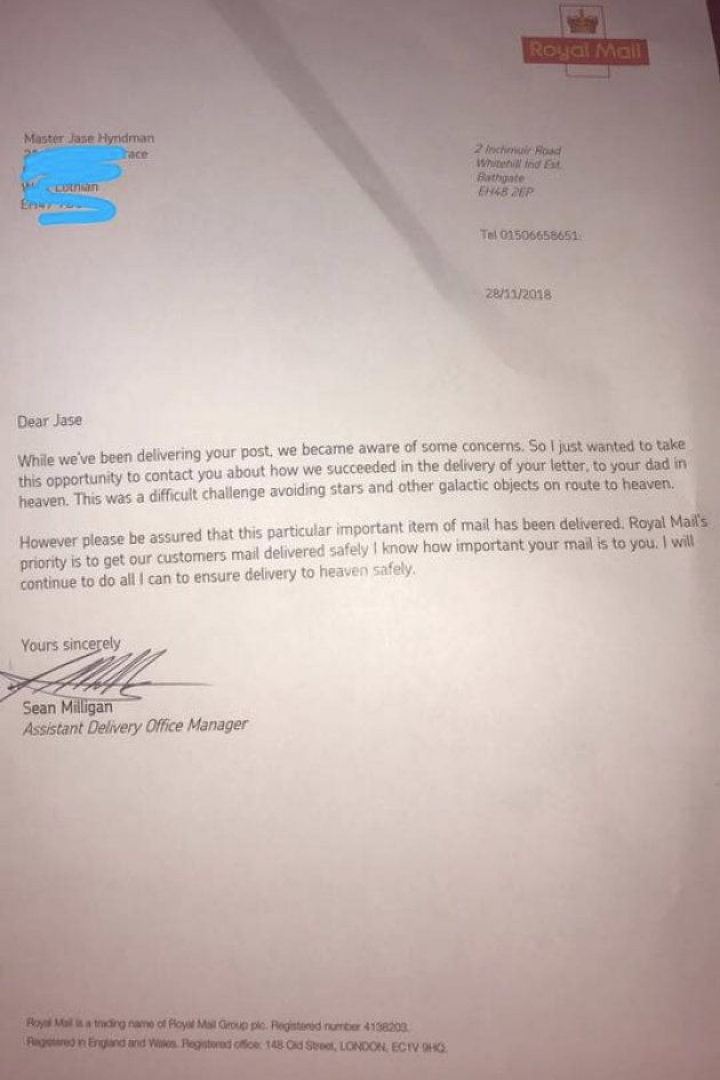 Su madre, Teri Copland, compartió este miércoles en Facebook la imagen del sobre escrito por el pequeño así como una foto de la emotiva respuesta de Royal Mail, la compañía nacional de servicios postales de Reino Unido. En la misiva, el cartero cuenta entre otros detalles lo difícil que había sido evitar "las estrellas y otros objetos galácticos en la ruta de reparto al cielo".