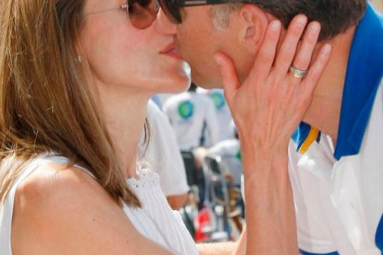 Los días de 'descanso' en Mallorca de los reyes nos han dejado imágenes muy cariñosas entre ellos. En esta, Letizia besa a su marido durante la Copa del Rey de Vela en el año 2011.