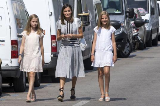 Las alpargatas se han convertido en un básico de las salidas de Letizia por la isla. Aquí con Leonor y Sofía en el Real Club Náutico de Palma en 2018.