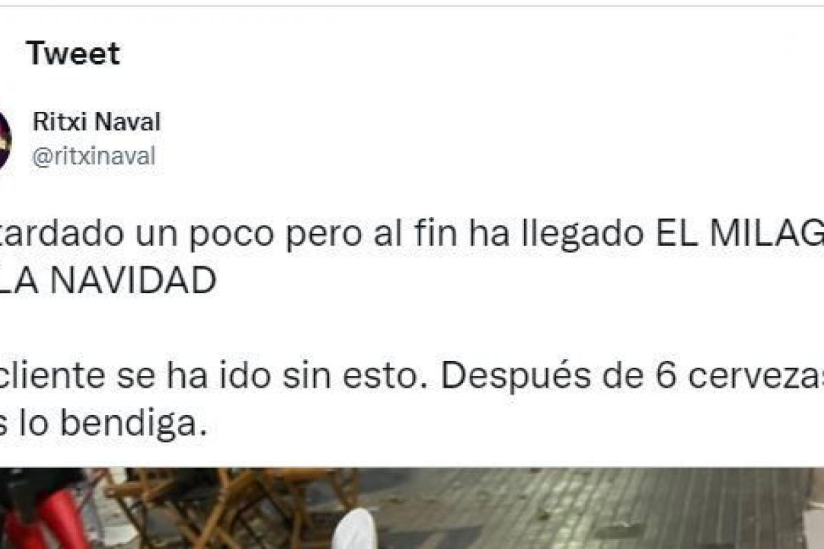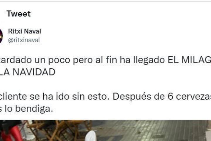 “Ha tardado un poco pero al fin ha llegado EL MILAGRO DE LA NAVIDAD. Un cliente se ha ido sin esto. Después de 6 cervezas. Dios lo bendiga”, ha escrito el usuario junto a la foto, en la que aparece una muleta.