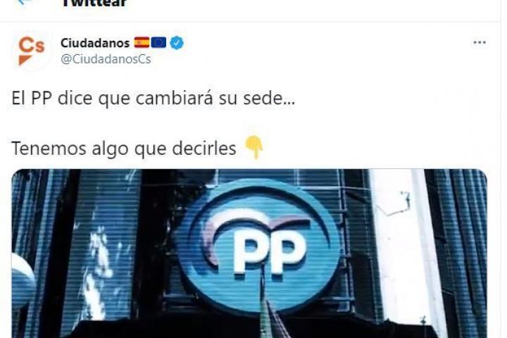 Ciudadanos ha publicado un tuit que está siendo sumamente comentado en la red social. El mensaje ha llegado después de que el líder del PP, Pablo Casado, anunciase que el partido cambiará de sede y abandonará la de la calle Génova.
