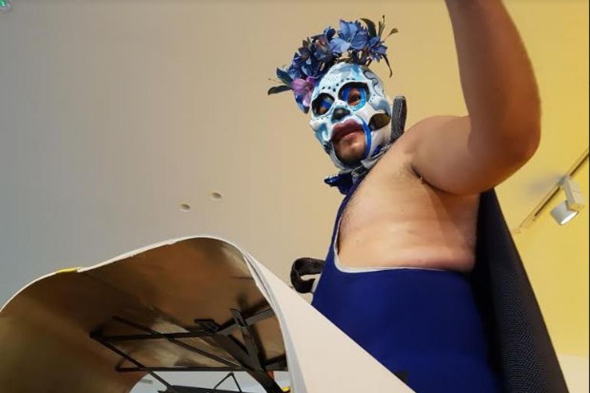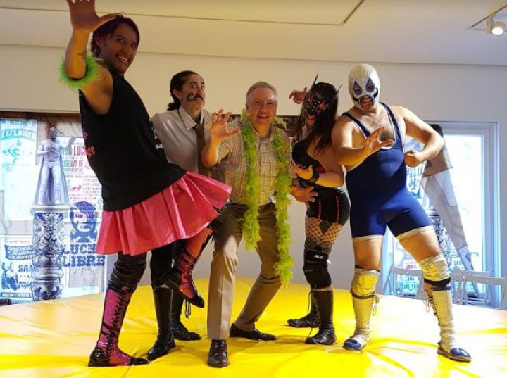 Una lucha llena de locura, de golpes reales, de moratones, que suenan sobre el cuadrilátero cuando se hace caer al contrario. Golpes que duelen al espectador seguramente más que al luchador caído que al ser tirado sobre el acolchado suelo del ring produce un ruido como si se hubiera podido partir por mil y un sitios. Una lucha que favorece y facilita la transformación. De tal manera que me cuenta la compañía que ahora se está llenando de luchadores “exóticos”. Esos que asumen roles LGTBI pero sin reivindicación ninguna. Por el simple hecho de serlo y vivirlo. Sin afectación ni debilidad. Algo similar a lo que ocurre en esta obra con la aparición de un tal Narciso, que a pesar de su excentricidad, su pelo morado, su amaneramiento, su torso desnudo y su falda rosa, lucha como el que más por imponerse a Mr. Mundo. O la madre luchadora que se ve por los mercados mexicanos haciendo la compra como la que más.