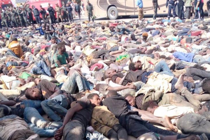 Migrantes amontonados en la explanada delante del paso fronterizo tras el intento de salto de la valla de Melilla del pasado 24 de junio.EUROPA PRESS/AMDH-NADOR