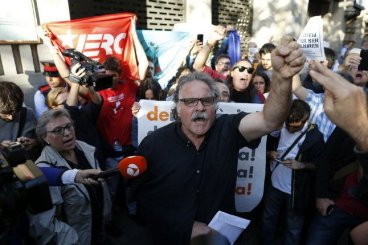 Entre los congregados están el eurodiputado del PDeCAT Ramon Tremosa, el diputado de JxSí en el Parlament Lluís Llach y los presidentes de la ANC y de Òmnium Cultural, Sànchez y Jordi Cuixart. Junto a ellos está el diputado de ERC en el CongresoJoan Tardà, que ha pedido paciencia y civismo a los manifestantes.