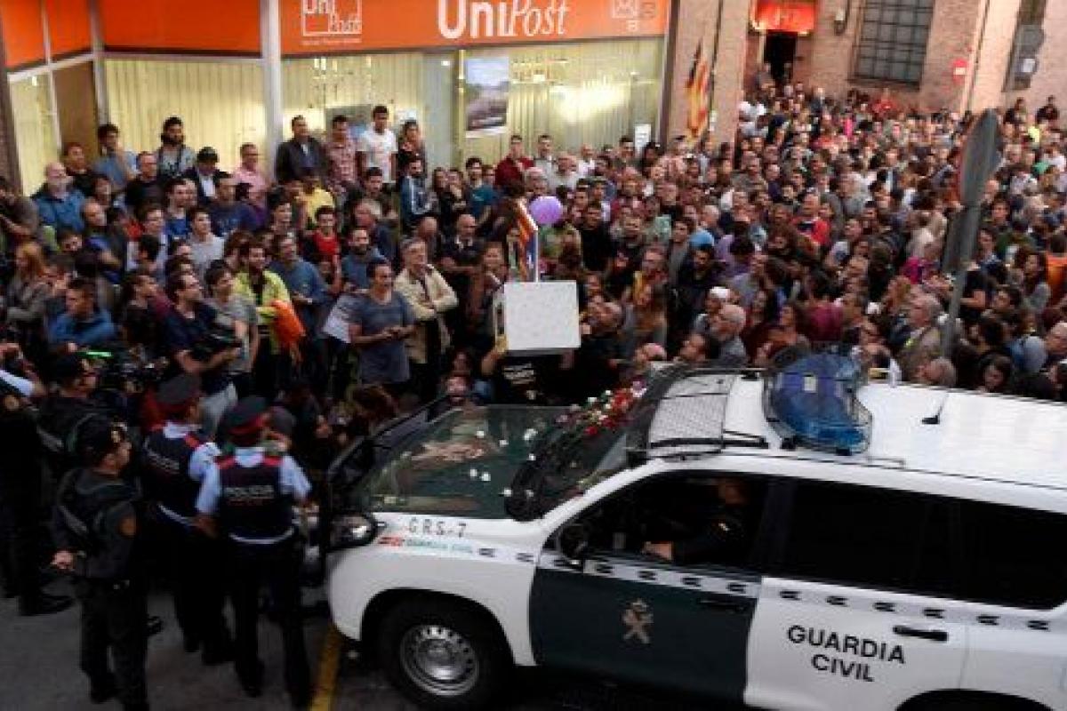 El secretario judicial logró entrar en la empresa, cubierto con un pasamontañas y por el garaje, después de que los Mossos d'Esquadra se llevaran en volandas a una treintena de jóvenes que, sentados en la calle, trataban de impedir el paso de la comitiva judicial y gritaban consignas a favor del referéndum del 1 de octubre.