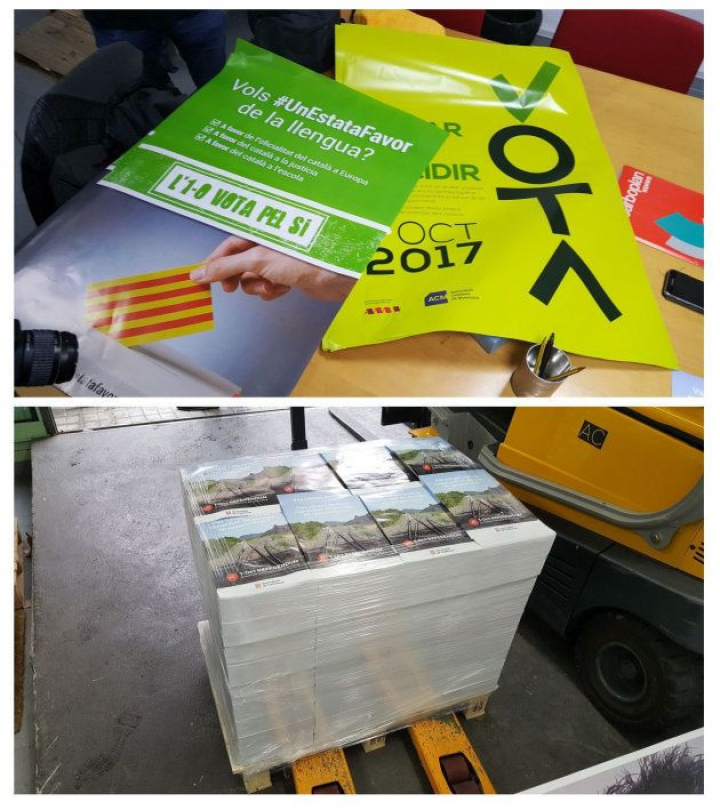 Los agentes han encontrado además de los carteles con el logo de la Generalitat otros que "en los que expresamente se invita a votar sí". Según una primera estimación, calculan que el peso de toda el material intervenido rondaría la tonelada y media.