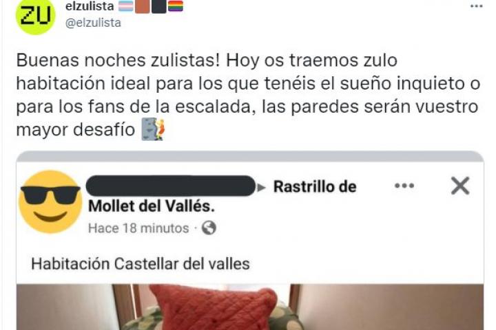 “Buenas noches zulistas! Hoy os traemos zulo habitación ideal para lo que tenéis el sueño inquieto o para los fans de la escalada, las paredes serán vuestro mayor desafío”, comentaba el tuitero junto con la captura de pantalla del anuncio.