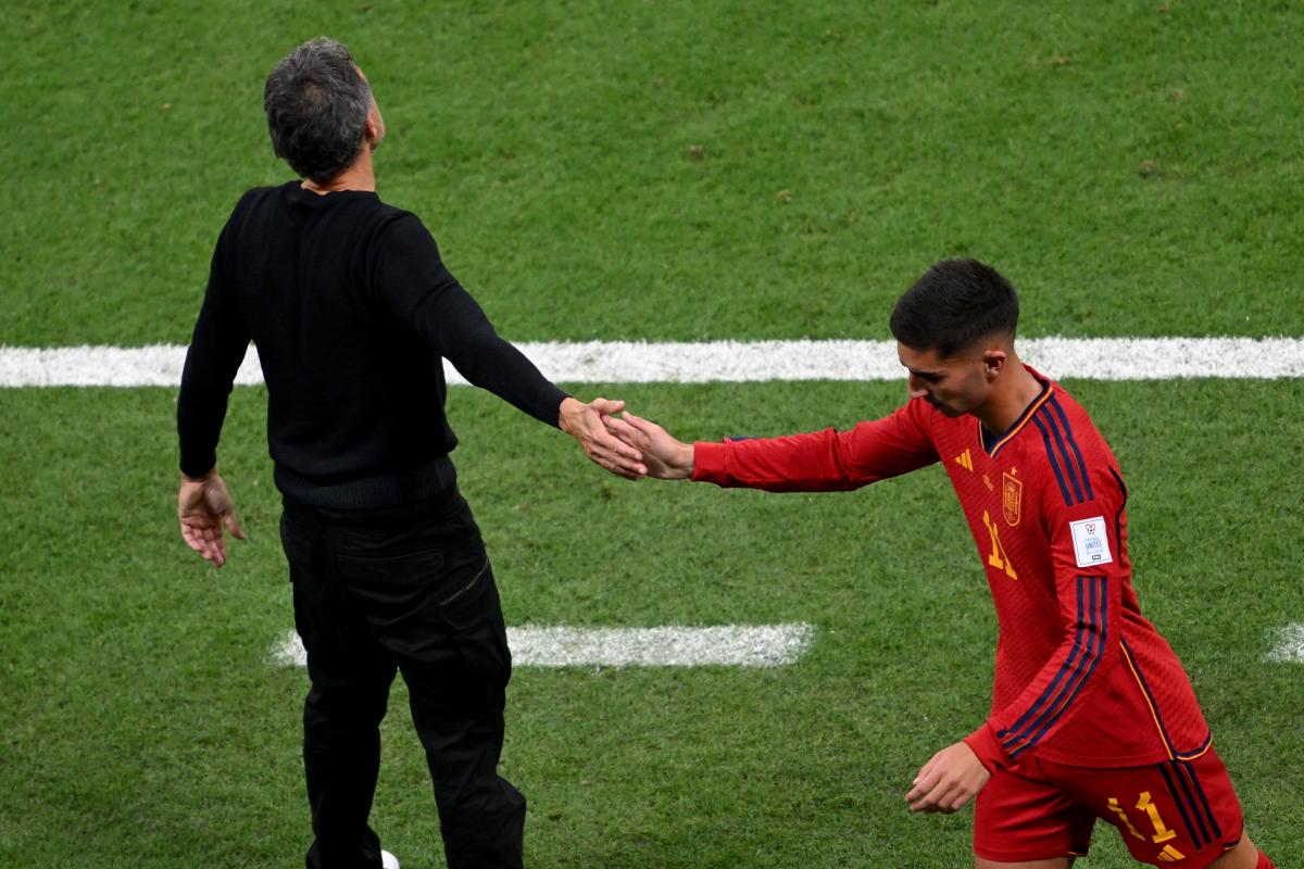 Luis Enrique y Ferrán Torres se chocan la mano en el España-Alemania del Mundial de Qatar. Robert Michael/dpa (Photo by Robert Michael/picture alliance via Getty Images)picture alliance via Getty Images