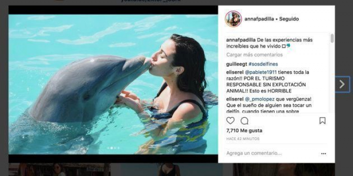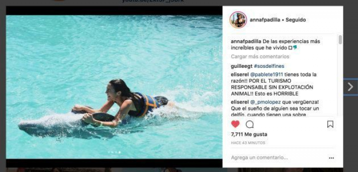 La joven de 21 años ha adjuntado cuatro imágenes en las que aparece disfrutando en una piscina junto a un delfín.