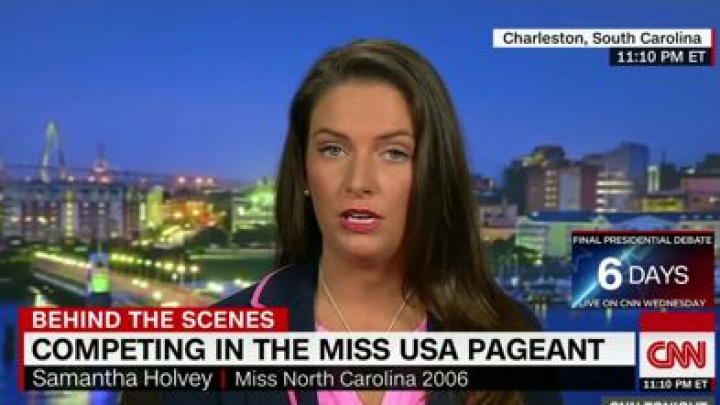Samantha Holvey, ex Miss Carolina del Norte, sostiene que en 2006 Trump se metió en los vestuarios de las concursantes y les hizo formar una cola para ponerse "delante de cada una de las chicas y mirarnos de arriba abajo como si fuéramos carne, objetos sexuales, no éramos personas".