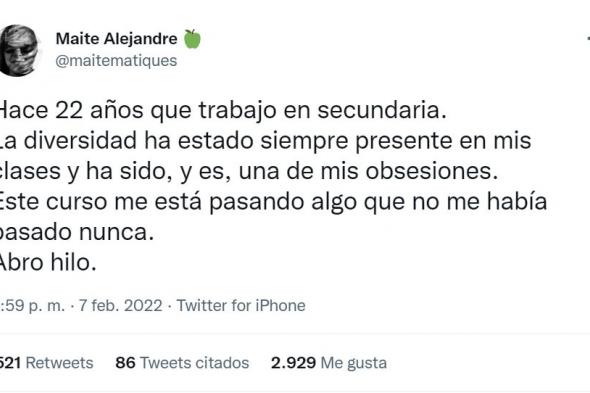 La tuitera y profesora de Matemáticas en un instituto Maite Alejandre ha contado en Twitter lo que está viviendo este año en una de sus clases con un alumno con un alumno con “un diagnóstico de varias dificultades que fueron detectadas muy pronto”.