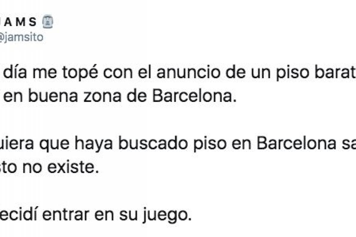 Como gancho, el tuitero ha utilizado una situación bastante usual en España: el problema del alquiler. Desde Barcelona, donde los precios han acumulado en los últimos cinco años un crecimiento del 36,4%, @jamsito ha entrado en el juego de un timo que aún no tiene desenlace.