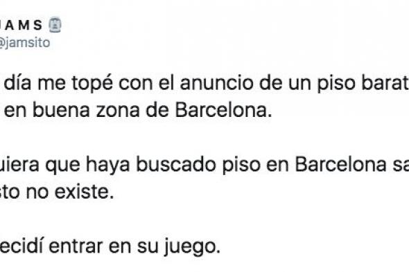 Como gancho, el tuitero ha utilizado una situación bastante usual en España: el problema del alquiler. Desde Barcelona, donde los precios han acumulado en los últimos cinco años un crecimiento del 36,4%, @jamsito ha entrado en el juego de un timo que aún no tiene desenlace.