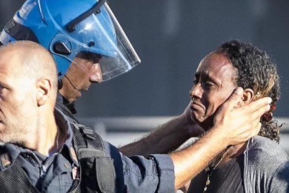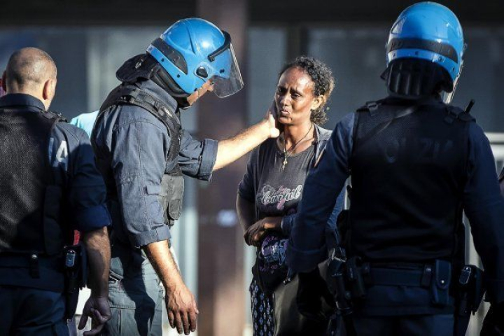 En ella aparece un policía consolando a una mujer que llora asustada mientras un centenar de inmigrantes protestan en la plaza de la Independencia en Roma.