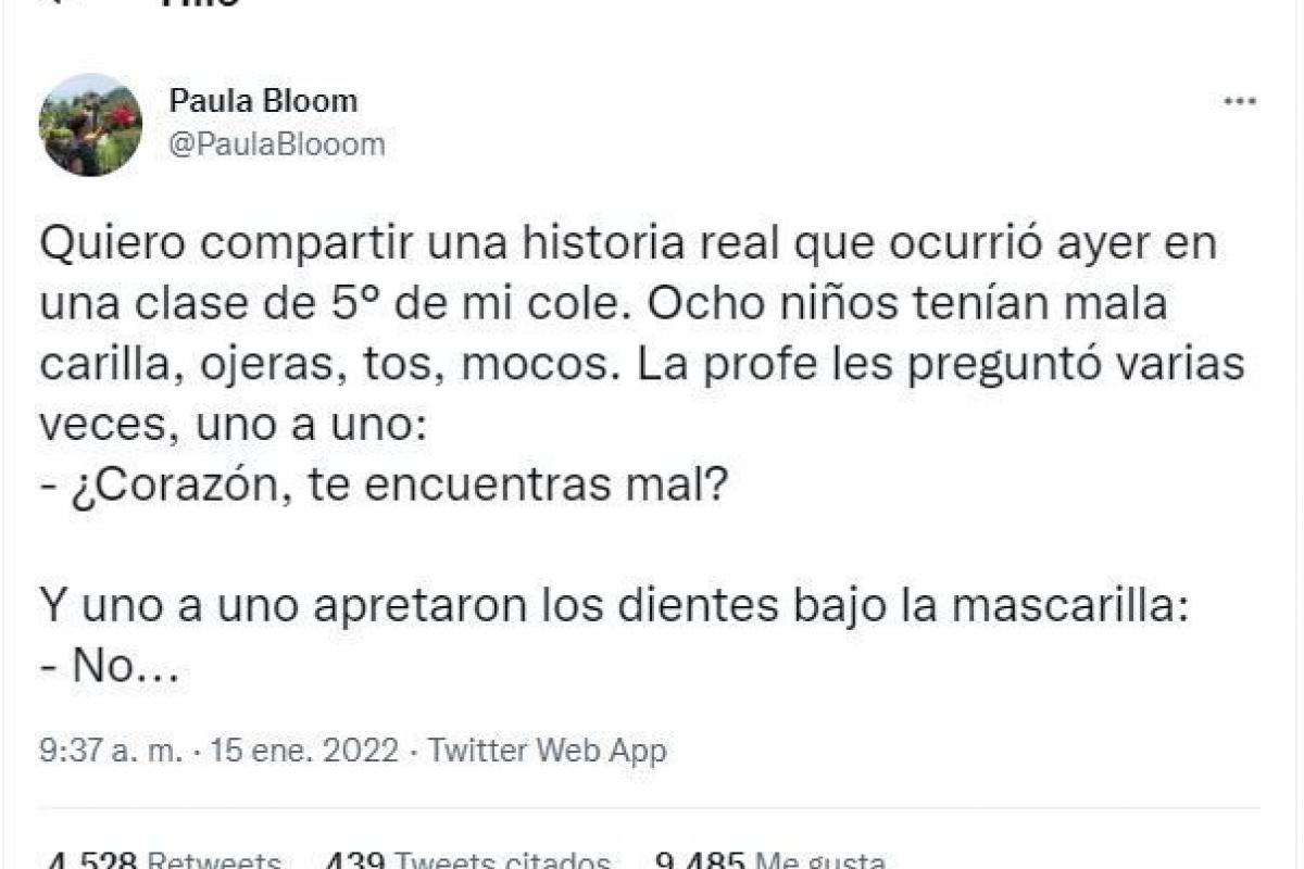 La usuaria de Twitter @PaulaBlooom, que es profesora de Primaria en un colegio, ha relatado una escena real que ha vivido en su centro educativo y que evidencia la realidad de la conciliación y de la educación en estos tiempos de pandemia: los niños acuden enfermos a clase porque sus padres no tienen con quién dejarlos.