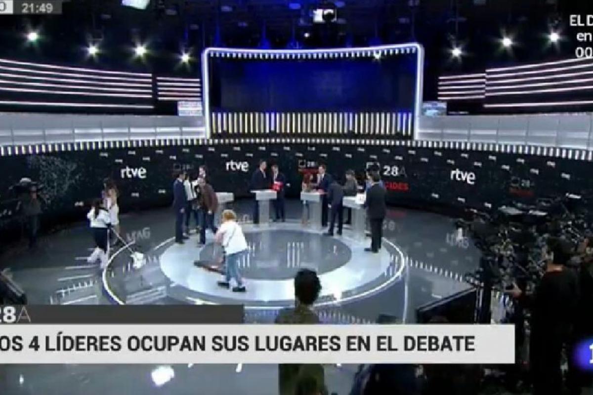 Uno de los momentos más llamativos de la cita electoral ocurrió antes de que empezase: mientras los políticos y sus asesores preparaban sus intervenciones varias mujeres se encargaban de pasarle la mopa al plató.