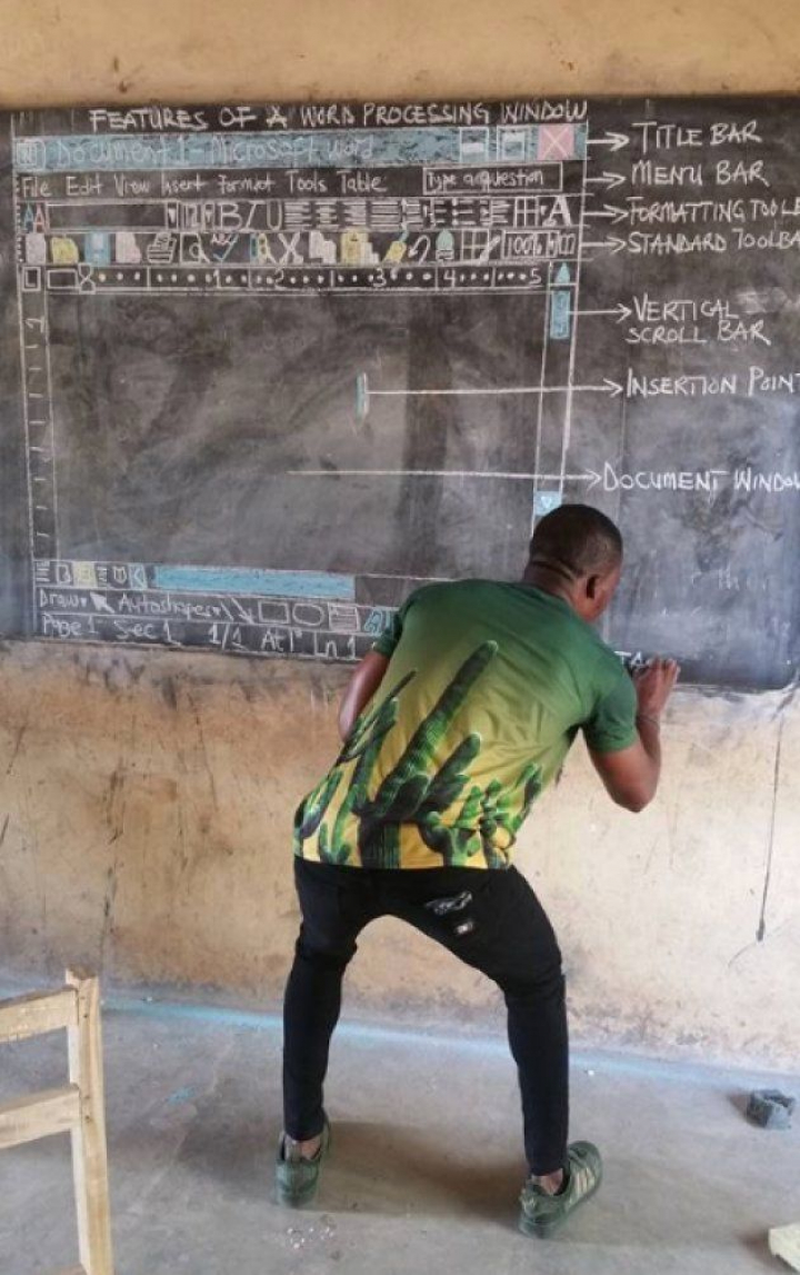 El centro no cuenta con ordenadores para los alumnos, así que el maestro dibuja en la pizarra hasta el más mínimo detalle de lo que se vería en la pantalla del ordenador, por ejemplo, al abrir el programa Microsoft Word.