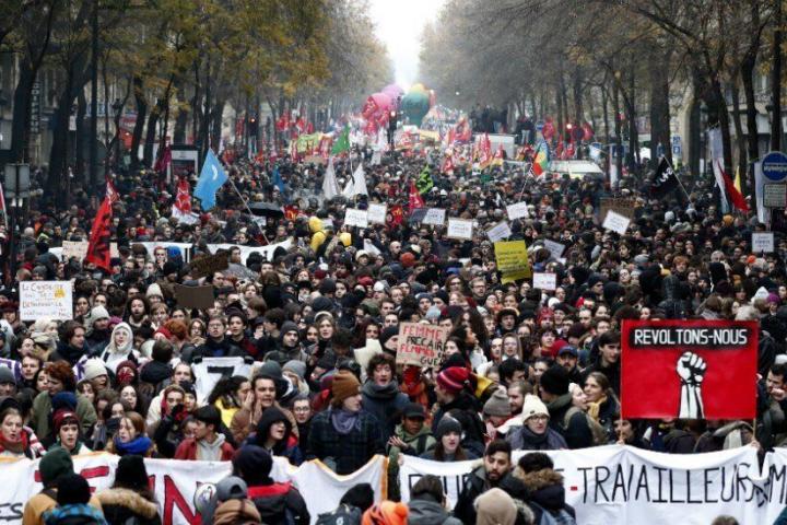 Los sindicatos se manifiestan contra el plan del Ejecutivo de sustituir los 42 regímenes de jubilación actuales por un sistema por puntos en el que cada euro cotizado dé los mismos derechos a todo el mundo.