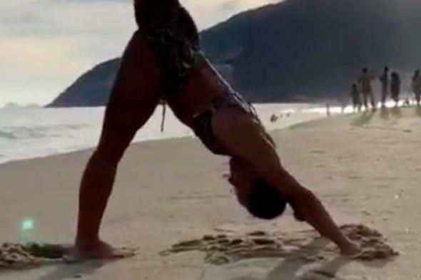 Una mujer hace yoga en la playa. Graba sus posturas sobre la arena, con un fondo paradisíaco: el sol, oculto tras las nubes, corona una peña mientras las olas rompen. De repente, un elemento lo transforma todo en algo completamente nuevo.