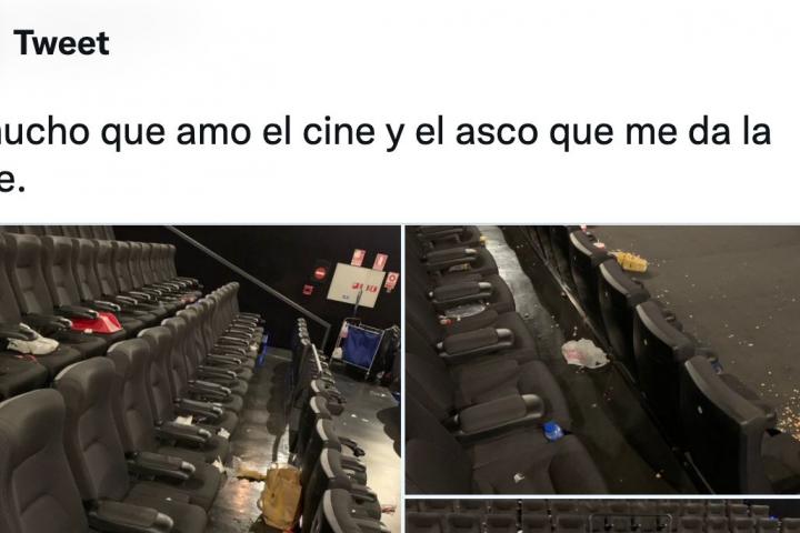 En el tuit se pueden ver tres fotografías de una sala de cine en la que hay multitud de porquería por todos lados: cajas de palomitas por el suelo y por los asientos, envoltorios de hamburguesas, vasos de refresco y botellas.