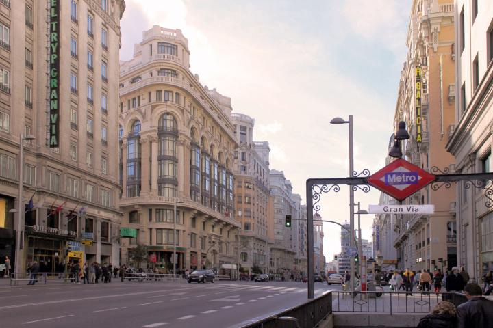 Madrid, Spain - February 6, 2010: View from street level of Gran Via avenue on a winter’s evening next to Metro station entrance with a few traffic and pedestrians walkingAlberto Blu via Getty Images